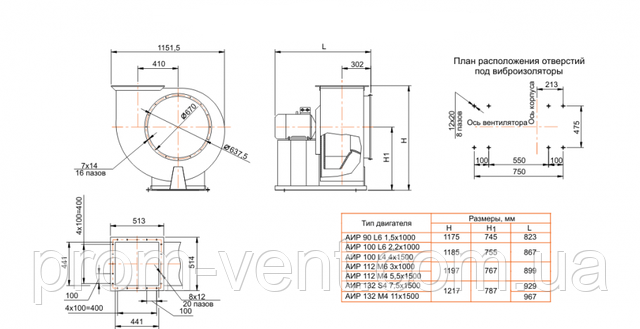 Габаритні розміри, вентилятор ВЦ 4-75 No6, 3 с. 7,5 кВт 1500 об./хв