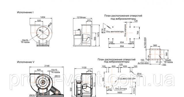 Габаритні розміри, вентилятор ВЦ 4-75 No8 з дв. 5,5 кВт 1000 об./хв