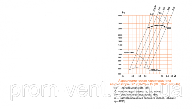 Аеродинамічні характеристики, вентилятор ВЦ 10-28 No3,15 з дв. 4 кВт 3000 об./хв.