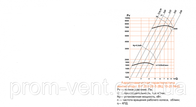 Аеродинамічні характеристики, вентилятор ВЦ 10-28 No5 з дв. 5,5 кВт 1500 об./хв.